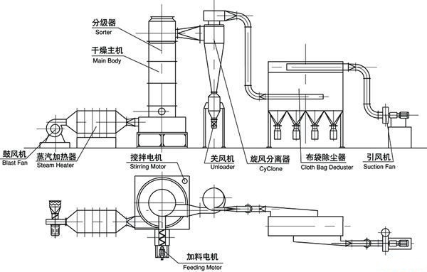 熱空氣切線進入干燥器底部,在攪拌器帶動下形成強有力的旋轉風場。濾餅類物料、膏糊狀物料由螺旋加料器定量加入干燥器內,在高速旋轉攪拌槳的強烈作用下,物料受撞擊、磨擦及剪切力的作用從而被分散,塊狀物料迅速粉碎,與熱空氣充分接觸、受熱、干燥。脫水后的干物料隨熱氣流上升,上部分級環將大顆粒截留,小顆粒從環中心排出干燥器外,由旋風分離器和除塵器回收,未干透的大塊物料受離心力作用甩向器壁,重新落到底部被粉碎干燥。