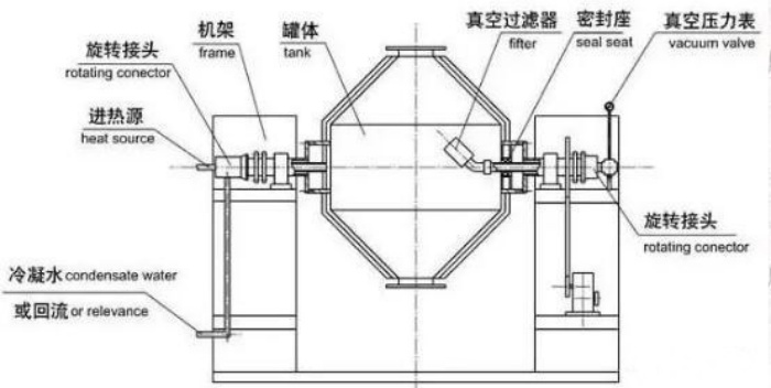 ◎ 在動力驅動下,罐體作緩慢旋轉,罐內物料不斷地翻動、混合,從而達到強化干燥的目的。