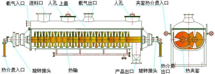 空心軸上密集排列著楔型中空槳葉,熱介質經空心軸流經槳葉。單位有效容積內傳熱面積很大,熱介質溫度從-40℃到320℃,可以是水蒸汽,也可以是液體介質:如冰鹽水、熱水、導熱油等。間接傳導加熱,熱量主要用來加熱物料,使用極少量空氣帶走濕氣,熱量損失僅為通過器體保溫層向環境的散熱,以及少量尾氣攜帶的熱量。相互齒合的楔型槳葉之間具有互相清潔功能;而物料顆粒與楔型面的相對運動產生洗刷作用,能夠洗刷掉楔型面上附著物料,使運轉中一直保持著清潔的傳熱面。